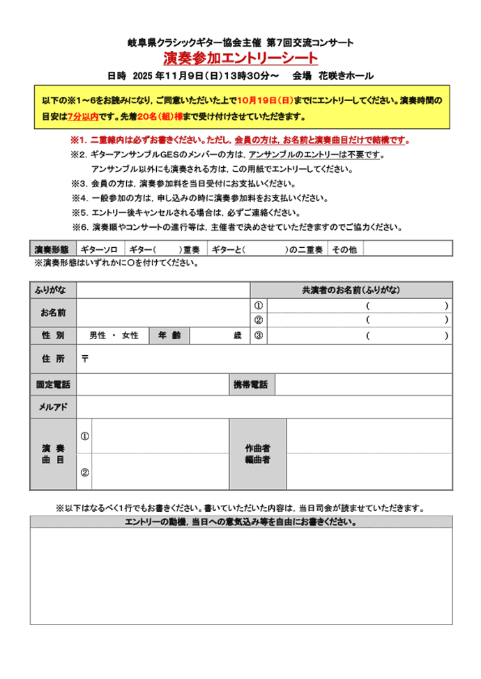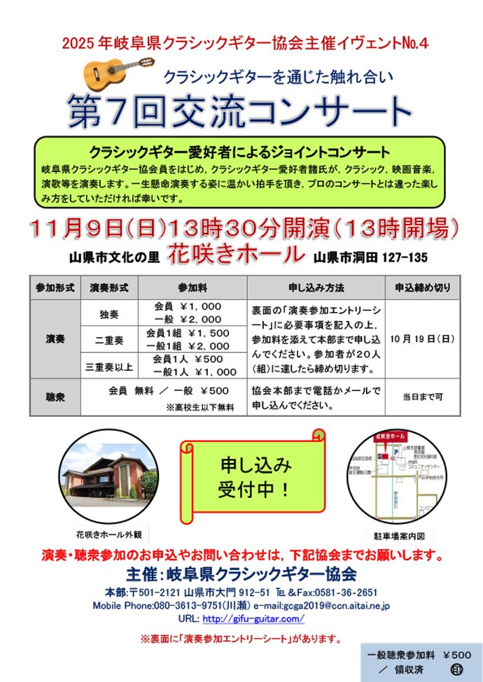 岐阜のベテランギタリスト川瀬寛の「真詮ギタースクール」クラッシックギター専門の音楽教室です。基礎から専門家を目指す人まで、親切丁寧に指導いたします。 《 お知らせ 》 2025/07/02 主宰 川瀬寛のプロフィールを更新しました。 2025/07/02 イベント記録を更新しました。 2025/05/15 イベント予定を更新しました。 2025/02/20 イベント予定を更新しました。 2025/02/20 資料室を更新しました。 教室主宰(川瀬寛)プロフィール イベント予定 イベント記録 資料室 2025年岐阜県クラシックギター協会主催イベントNo.4クラシックギターを通じた触れ合い第7回交流コンサート2025年11月9日(日)13:30~山県市文化の里 花咲きホール 岐阜県クラシックギター協会2019年1月発足詳しくはこちらをご覧ください。 岐阜県クラシックギター協会2019年1月発足詳しくはこちらをご覧ください。 岐阜県クラシックギター協会規約はコチラ どのコースからでも入会できます♪ 興味のある方はお気軽にご連絡ください。ギターを持っていなくても、気軽に始められます。希望者にはギターをレンタルします。「レンタル料1か月2,000円」 個人レッスン基礎コース伊自良教室(月・水・金・土)西岐阜駅前教室(日・水) 初級コース中級コース上級コースワンレッスンアンサンブルレッスン 岐阜市内コミュニティセンター(第1・3土曜日) 川瀬寛のギター教室 所在地 真詮ギタースクール伊自良教室〒501-2121岐阜県山県市大門912-51電話:0581-36-2651 真詮ギタースクール西岐阜駅前教室市橋コミュニティセンターまたは市橋公民館 真詮ギタースクール入会要項 集合個人レッスン「カルチャーアカデミー 岐阜新聞・ぎふチャン」教室講座名曜日・時間駅前プラザ教室ゼロからはじめるこどものためのクラシックギター第1・3金曜日午後5時30分~午後6時20分ゼロからはじめるクラシックギター第1・3金曜日午後6時30分~午後7時20分詳しくはこちら!カルチャーアカデミーのご案内